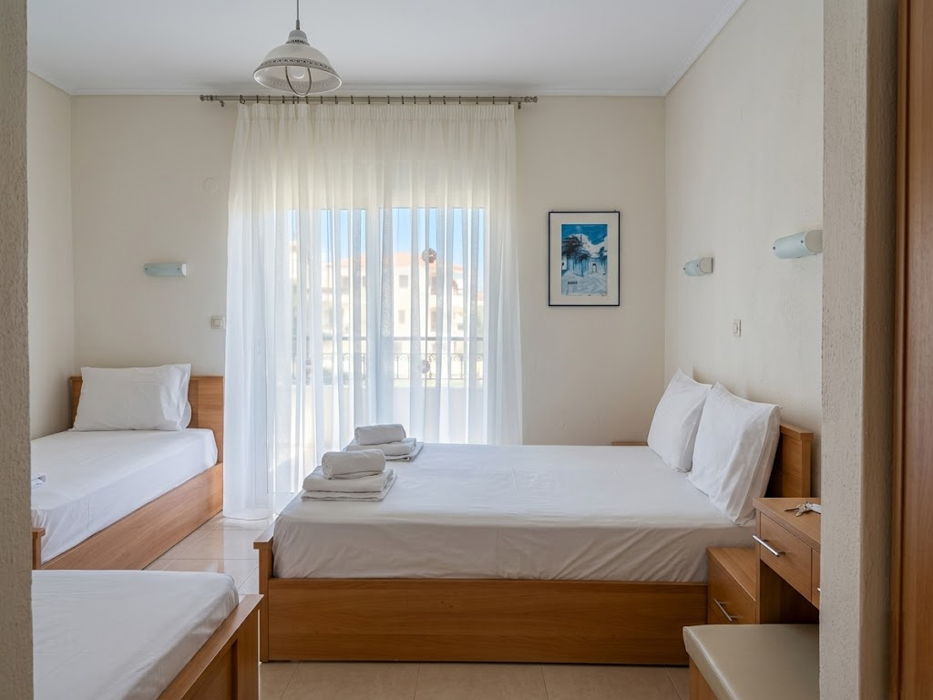 Featuring only 24 cozy rooms and studios with air conditioning, kitchenettes, and private balconies, we provide a warm, peaceful retreat perfect for couples and families who want comfort, convenience, and true Greek hospitality by the sea.